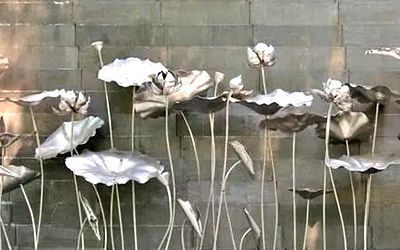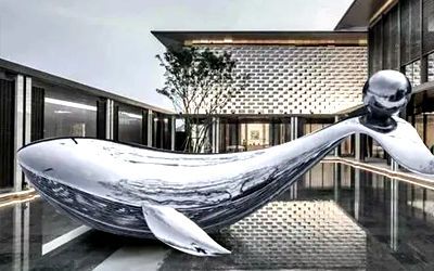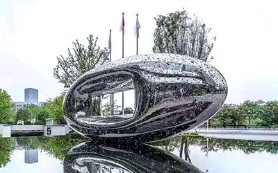 酒店不銹鋼雕塑以美為主,一般為裝飾性美陳景觀雕塑,常見于酒店大門、大堂、園林。包括但不限于水景景觀類,如圓環(huán)、噴泉、鏤空球;裝飾美陳類,如蓮花、翅膀、鵝卵石、水滴等。